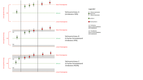 Nach vorheriger Absprache kann der Kunde auch ein mittleres Vertrauensniveau (B) vorgeben, wodurch sich der Akzeptanzbereich verkleinert, sodass auch Messergebnisse mit einem Vertrauensniveau von mindestens 95% mit einem Restrisiko von maximal 5% angenommen werden.