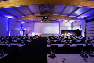 Unsere EVENT-HALLE 1 umfasst 600 qm und bietet ausreichend Platz für bis zu 250 Personen. Die Aufteilung ist flexibel und kann individuell angepasst werden. Reihenbestuhlung, Palamentarische Sitzordnung usw.
