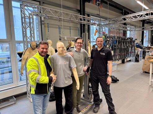 Gemeinsam mit Christian Wegscheider, Geschäftsführer der Help-24 in Wien, dem Generalimporteur für innovative Medizinprodukte und Elektro-Rollstühle in der DACH-Region, sowie Stefano Mastrogiovanni, Geschäftsführer des Technischen Dienstes ALEE - Alliance des laboratoires d'essai européenne aus Eppertshausen, hat Dr. Mirko Dobberstein mithilfe unseres Biofidel-Dummys Stürze älterer Menschen simuliert.