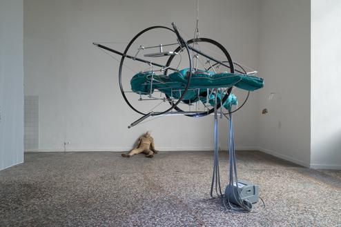 "Shock Mount" ist eine Stahlkonstruktion, die einem Mechanismus nachempfunden ist, der bei Tonaufnahmen verwendet wird und das Mikrofon von den Vibrationen des Raumes isoliert. Eine auf menschliche Größe skalierte Konstruktion, inspiriert vom Fixateur Externe, einem normierten Haltesystem, das normalerweise an den individuellen Knochen angepasst wird, hält eine Lymphdrainage-Anzug - Ganzkörperdruck. Generell kann Druck auf den Körper den Prozess der sensorischen Integration unterstützen. Wahrnehmungsstörungen können durch gleichmäßigen Druck, der das Gehirn zur Ruhe bringt, ähnlich einer festen Umarmung, gelindert werden.”