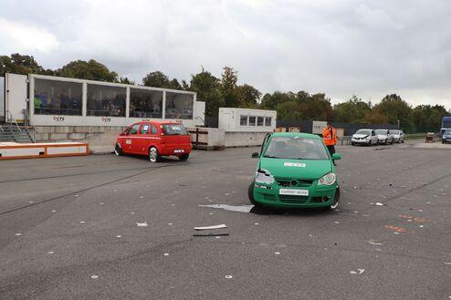 Nachdem sich die letzten Splitter gelegt hatten, gab unser Versuchsleiter Ralf Bührmann die Crashfläche zur Begutachtung der Fahrzeuge frei.