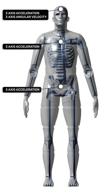 On request, the PRIMUS dummy can be equipped with crash-resistant measurement technology from Kistler. The recommended standard instrumentation includes sensors in the head, chest, and pelvis. The data recorder is securely integrated in the abdominal area and can record up to 48 channels for up to 30 seconds. The dummy can be connected to the vehicle’s measurement systems via a data cable or operated autonomously without one. The instrumentation must always be tailored to the specific research question. Therefore, the dummy can also be supplemented with additional sensors to investigate specific scenarios.