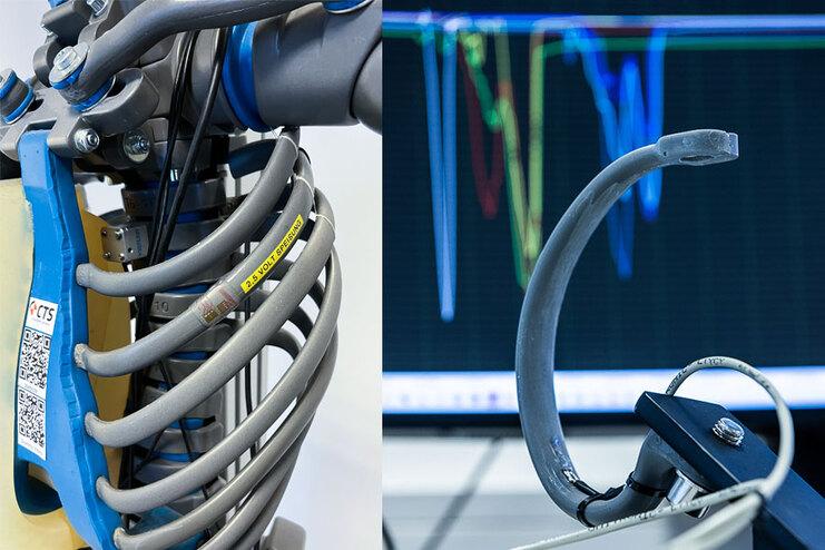 The application of strain gauges to the ribs enables the measurement of forces and bending moments acting on the ribs. Calibration can be performed either for individual ribs to determine the forces acting on each specific rib, or for the entire thorax including the surrounding soft tissue. In the latter case, externally applied forces on the thorax as a whole can be measured.